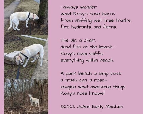 I've been mostly away from writing for a while, except for a weekly Zoom write that keeps my hand in, barely. I miss the daily practice, though, especially in these trying times. So I'm hoping to make my way back by reading and writing more poetry. I've always enjoyed playing with rhythm, so that seemed like a good place to begin again. This one was inspired by our Rosy in the park.